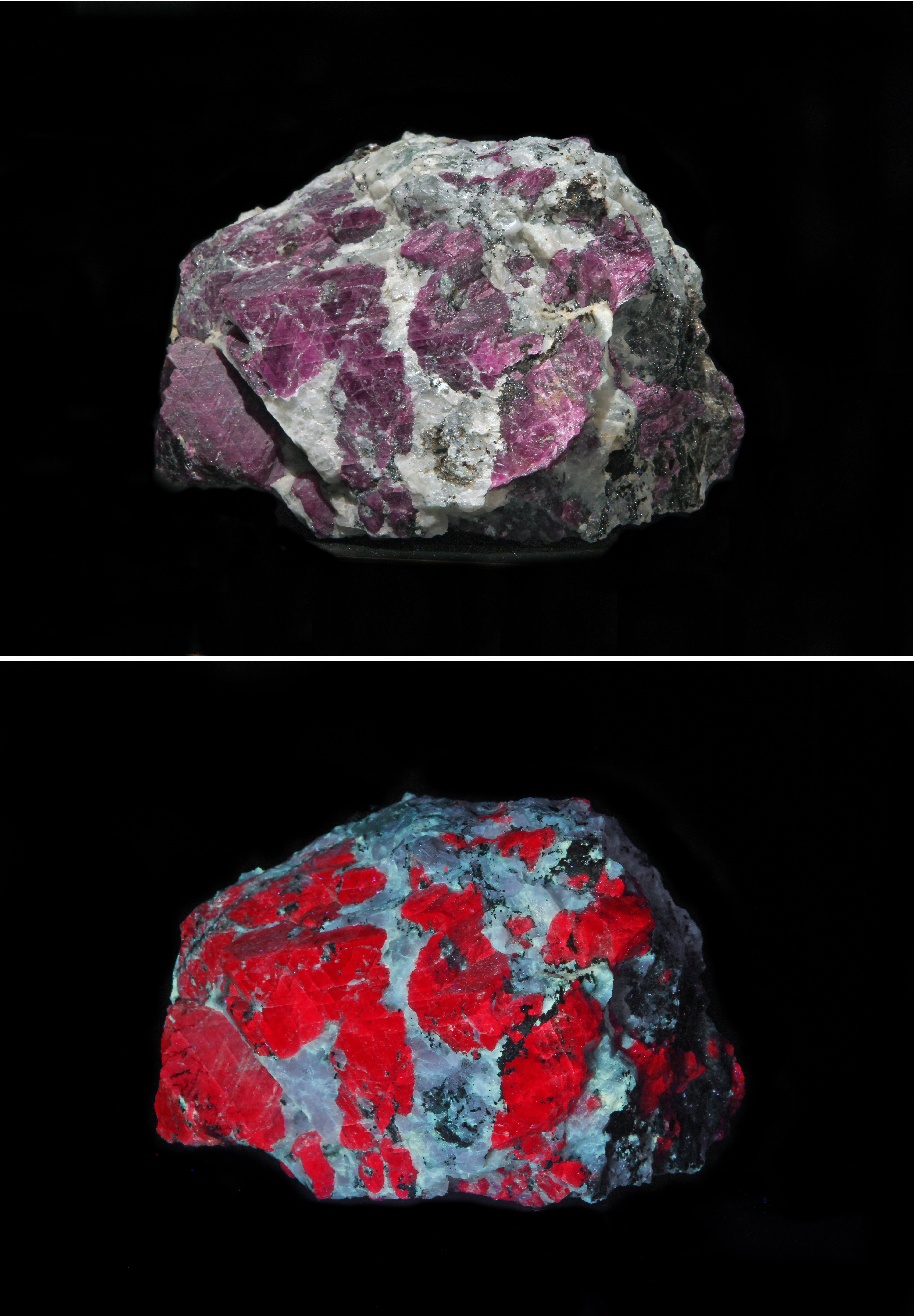 Glassy violet-pink ruby (variety of corundum) in white and grey matrix (A0179-0423); ruby (variety of corundum) showing fluorescent properties of bright red under ultraviolet light (A0179-0424); two views of ruby (variety of corundum): top view shows specimen in plain light; bottom view shows fluorescent properties of bright red under ultraviolet light (A0179-0425); Arendal, Froland, Norway.