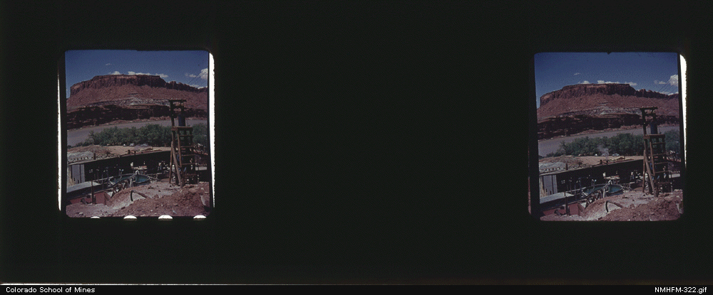 Stereopair slide showing the Vanadium Corporation of America's White Canyon Processing Plant located in Hite, Utah. This plant was built in 1949 by the Vanadium Corporation of America under contract with the US Atomic Energy Commission to process copper-uranium ores from nearby mines. The small mill operated as a pilot plant to supply uranium concentrate to the AEC until it was shut down in 1953. The mill was dismantled in about 1954. The site was inundated by the formation of Lake Powell in 1965 after an impact study was done and some high-grade tailings were removed from the mill site.