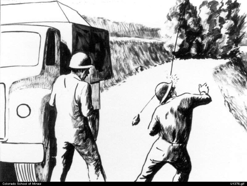 Illustration of two miners near a blast site in a surface mine, one miner being struck by rock debris.