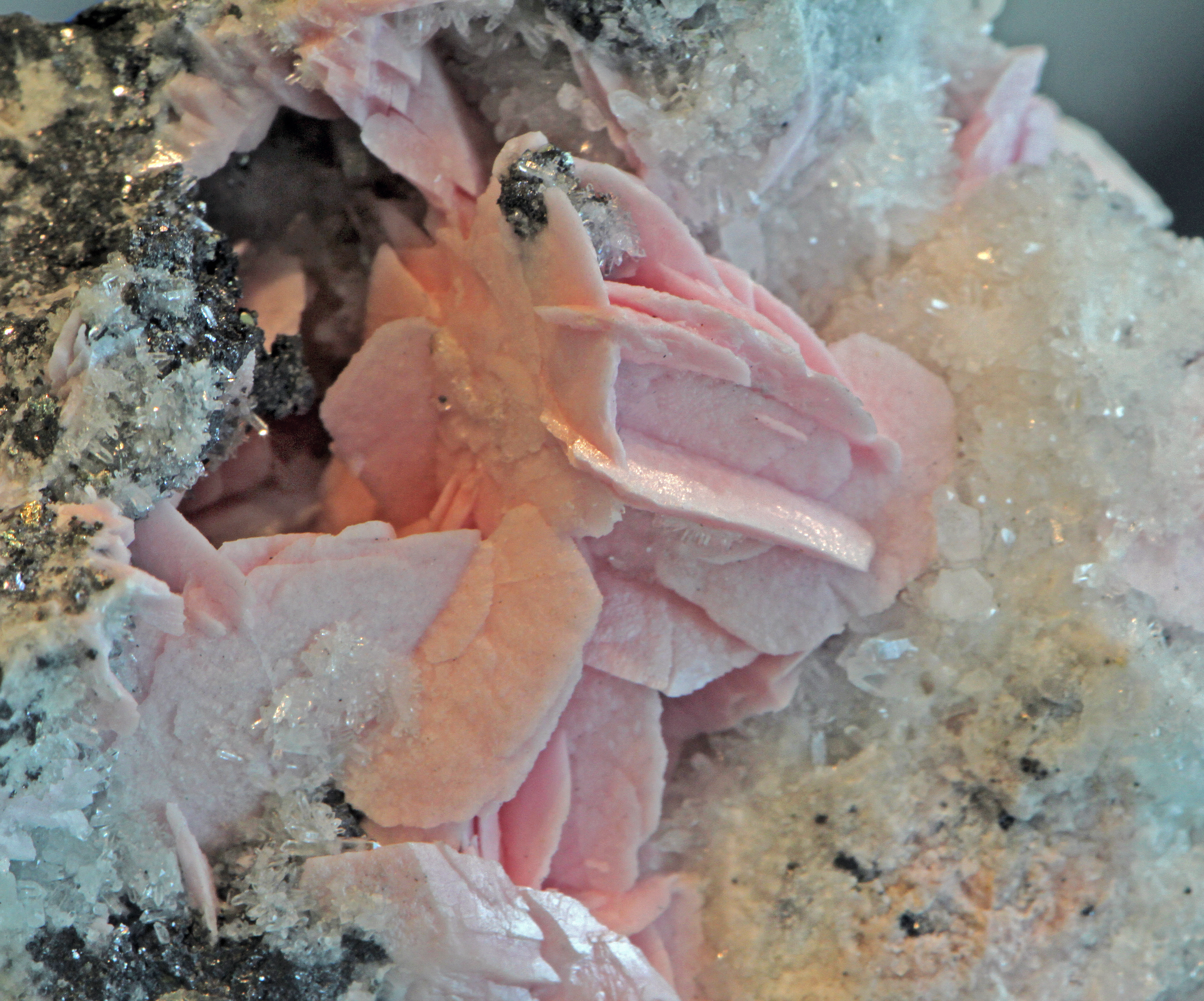 Pale pink opaque blades of rhodochrosite with fine-grained grey galena and small glassy quartz crystals on a white matrix.