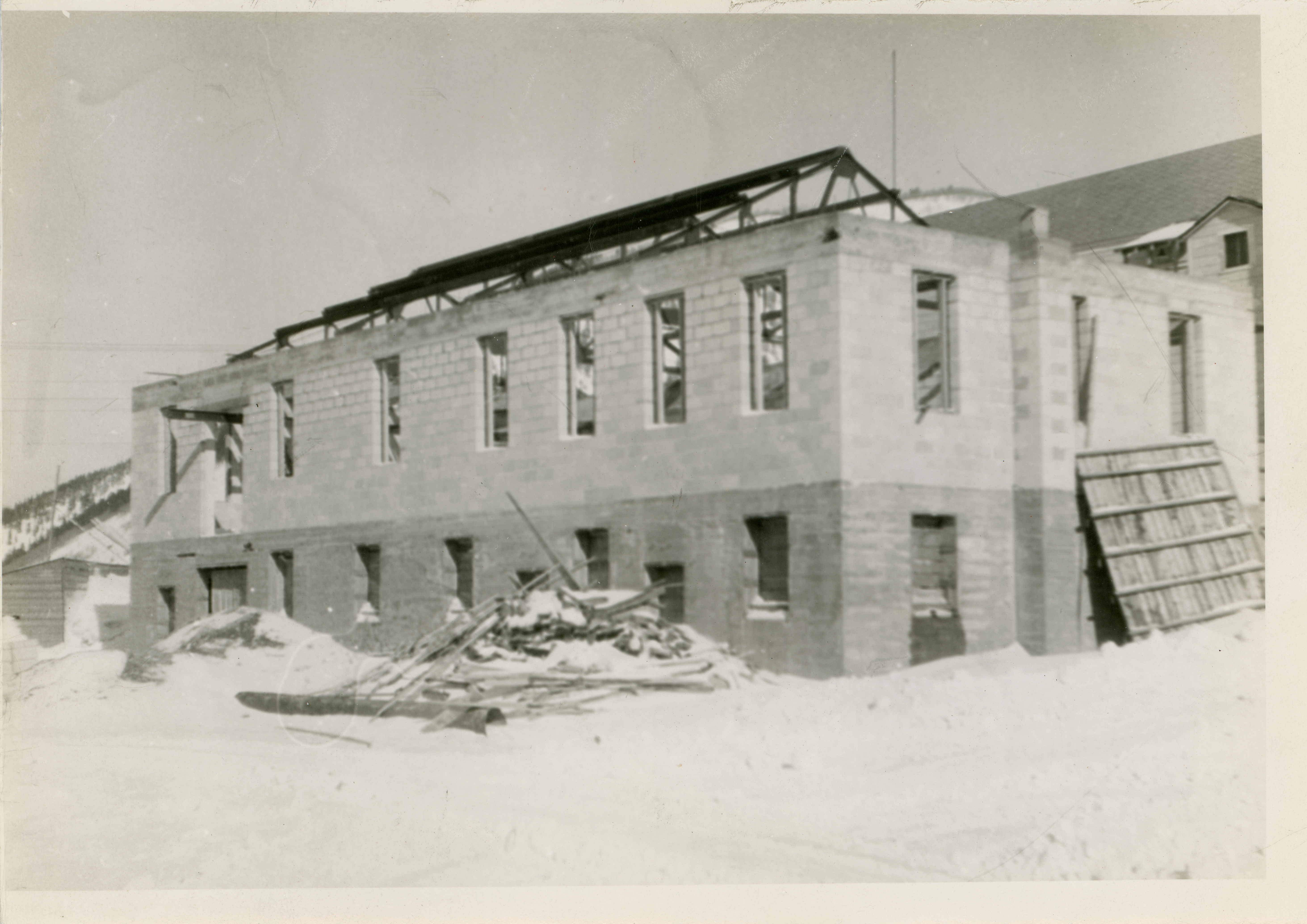Walls of the Gilman warehouse in the snow; the roof and windows are not finished.